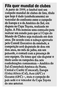 Somente na década de 1990 a FIFA volta a investir no seu projeto. Dessa vez, de forma firme e decidida, ela enfrenta a oposição europeia – que ainda existia e bate o pé: propõe o torneio em 1993, consegue sua aprovação no Comitê Executivo em 1996 e anuncia sua criação em 1997 (à direita, em recorte do Jornal da Tarde de 24/7/1997).