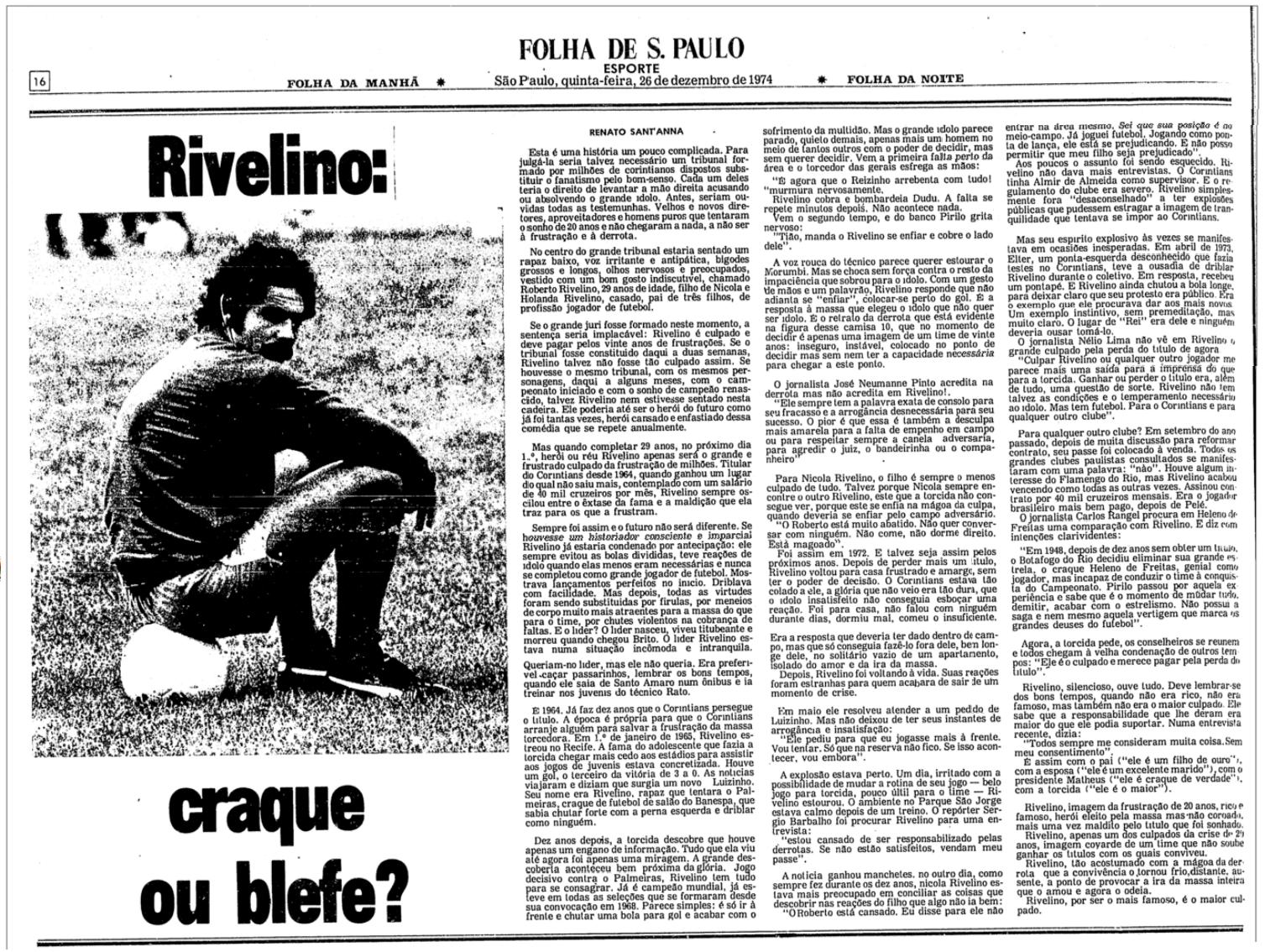 Outra mostra dessa fritura pode ser conferida no recorte abaixo, de matéria da Folha de São Paulo de 26/12/1974, com texto ácido e irônico, onde praticamente coloca um alvo na cara de Rivellino. Foi questão de dias até que a insatisfação com o vice virasse fúria – não com o vice, mas com o Reizinho.